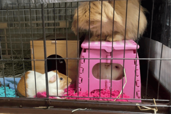 しかし、彼らの成長に伴い、はじめに購入したケージでは、手狭に感じるようになったので、犬用のケージを2つ連結してモルモット3匹とうさぎ1羽を一緒に飼育することにしました。