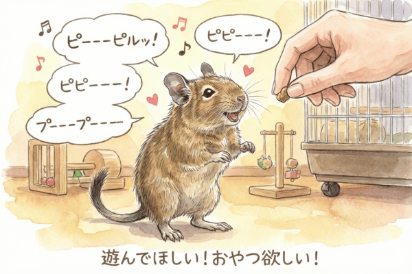 これらの鳴き声は、遊んでほしい時やおやつが欲しい時によく聞かれ、デグーが何かを求めているサインです。