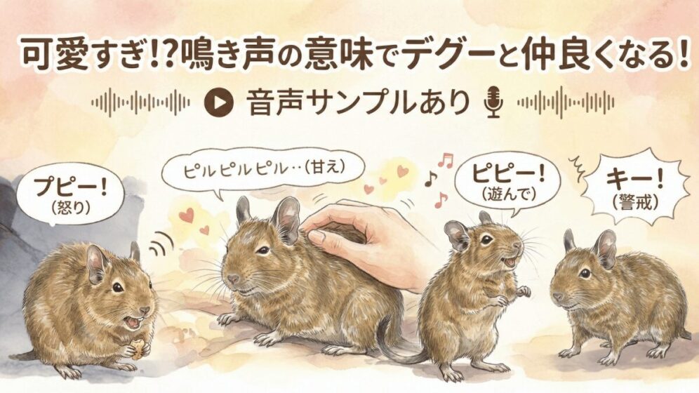 本記事では、デグーの鳴き声とそれぞれの鳴き声が意味する感情、鳴きやまない時の対処方法を解説しています。