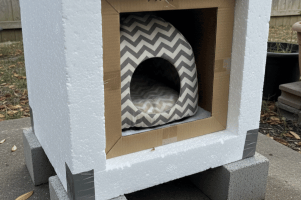 発泡スチロールのなかには、ダンボールでハウスを作成し、さらにその中の市販のハウスを設置し、その中に毛布を敷き詰める予定です。