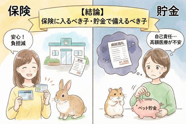 小さな体に対して医療費は決して安くなく、数回の通院で「お迎え価格の数倍」になることも珍しくありません。結局は「保険で備えるか、貯蓄で備えるか」という判断になります。